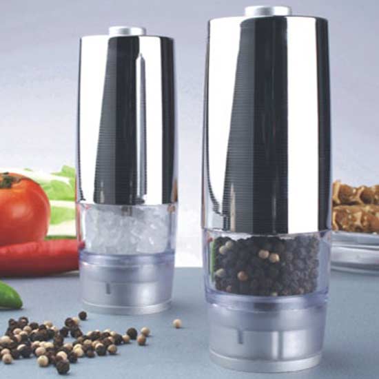 This electric pepper mill allows for quick grinding of pepper by simply pressing a button. It looks exceptionally modern with the shiny metal shell. The pepper is ground into fine grains for cooking or seasoning.
