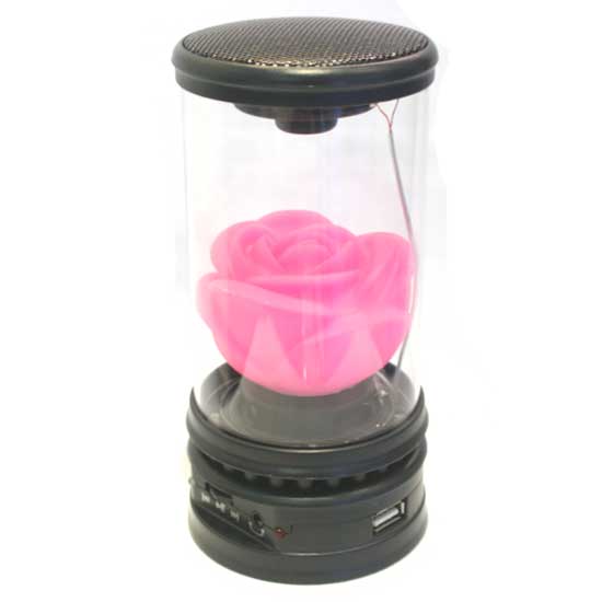 Shown here is a speaker fitted with a USB port. This piece can be used with mobile phones, computers, MP3 players, MP4 players and earphones. In particular, the speaker features a decorative floral embellishment within the transparent case.