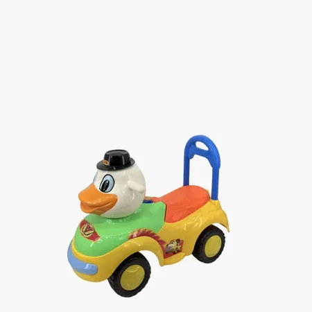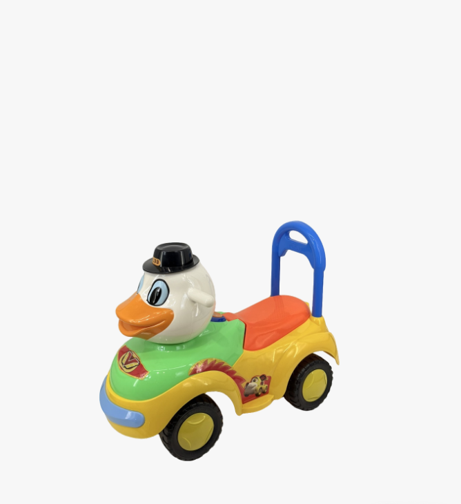2. 结构设计:采用四轮稳定布局,座椅为橙色防滑设计,车尾配有蓝色可伸缩推手,家长可直接推行;车头的卡通造型不仅是装饰,也能吸引孩子注意力,整体贴合幼儿的身体尺寸和使用场景。