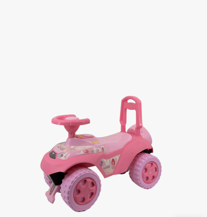 2. 结构设计:配有圆形方向盘、弧形靠背与后置推手,既方便孩子自主操控滑行,也能让家长推行;四轮采用大尺寸塑胶轮胎,胎面有防滑纹路,提升行驶稳定性。