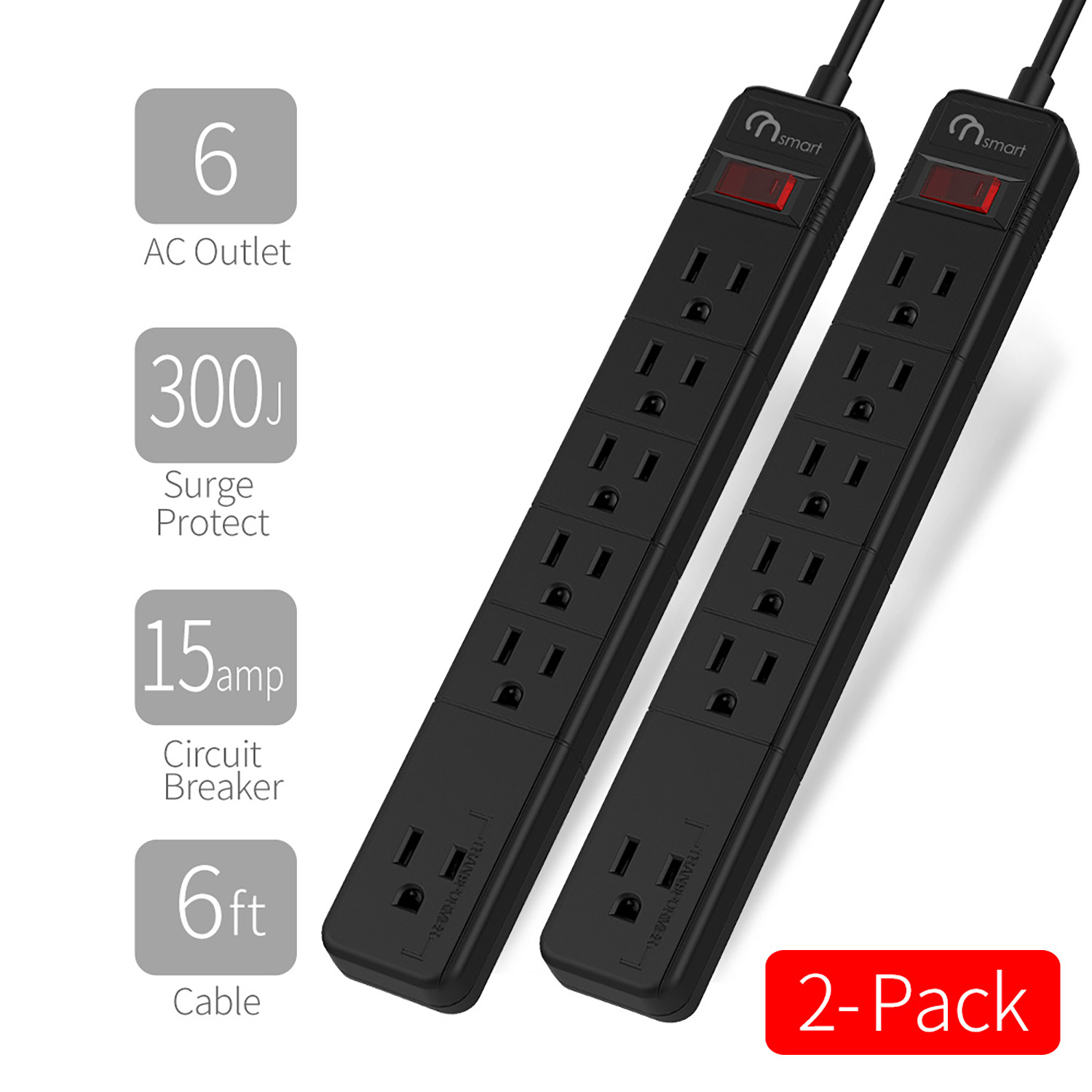 • ON Smart Solution 6 Total Outlets Surge Protector Power Strip-1 Transformer Outlets- 300J Surge Protection-15amp Circuit Breaker- Power Switch-Wall Mountable-6 Ft Cord 14 AWG-UL Listed- Black (2-PACK)