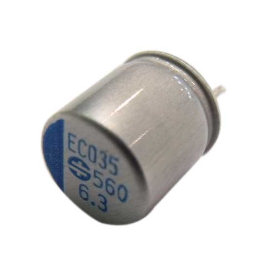 Shown here is a polymer radial electrolytic capacitor for motherboards, servers, VGAs, etc. It comes in a cylindrical shape and is labeled with electrical data on the surface. This electrolytic capacitor flaunts high ripple current capability and can work at a wide range of temperatures.