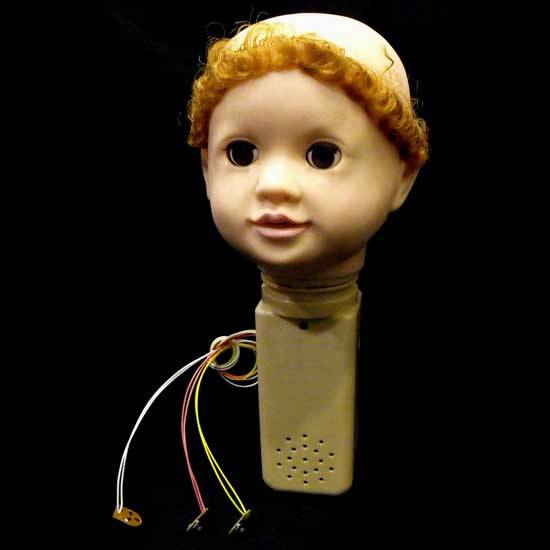Featured here is an electronic toy part that is made of ABS plastic material. This toy doll head is equipped with electronic sound effects. This intelligent toy part is ideal for any doll.