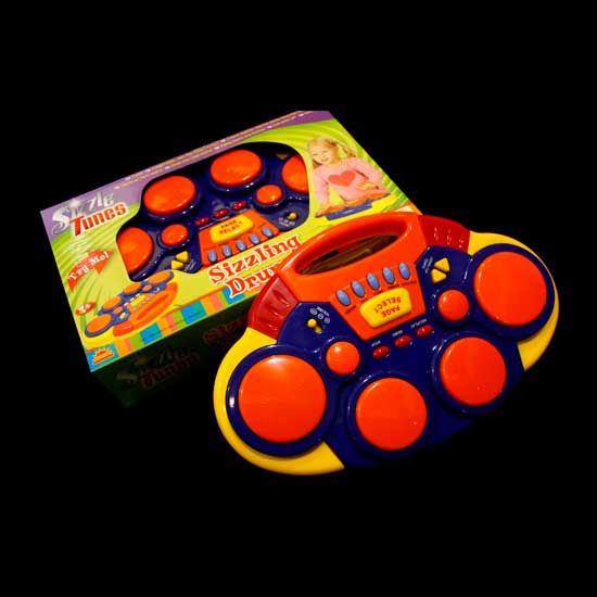As shown here is a toy drum playset that is designed with 6 pads for added performance. This versatile product features various functions such as auto power-off, volume control, recording function and so on. This toy drum playset offers hours of fun to children to play with.