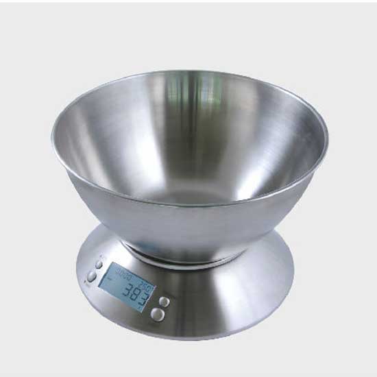 This electronic kitchen scale comes with a deep bowl-like platform made of stainless steel. It comes with a backlight display that can also show the clock, alarm and temperature. This practical digital kitchen scale is powered by 2 AAA batteries.
