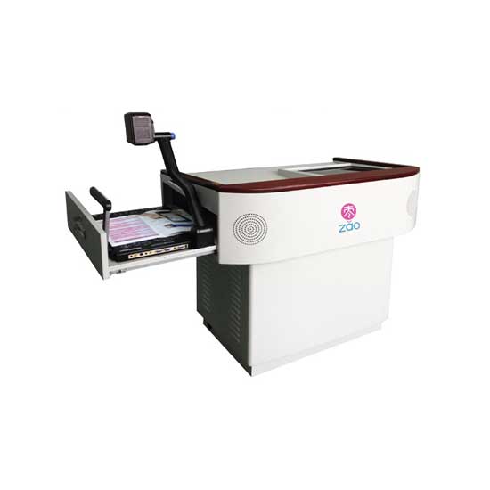 This is an electronic lectern with a white finish. The drawer-type cabinet design enables you to place books or notes under the visualizer. This electronic lectern is an ideal setting for both lecture rooms and classrooms.