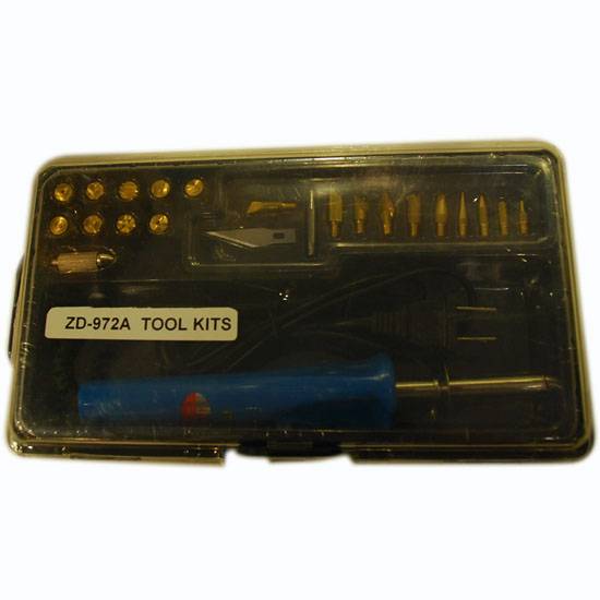 The electronic tool kit features a soldering iron, a knife graver, 9 pieces of countermark tips and 10 pieces of professional graver tips. They are packed in a case for convenience of storage. This all-in-one electronic tool kit offers a solution to small electronic projects.