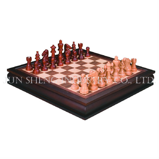 It is a chess set which includes a chess board and chessmen. The chessmen are in brown and cream colour. The elegance of the chess set creates an atmosphere of nobility. Either for decoration or playing, the chess set matches with most furniture's style.