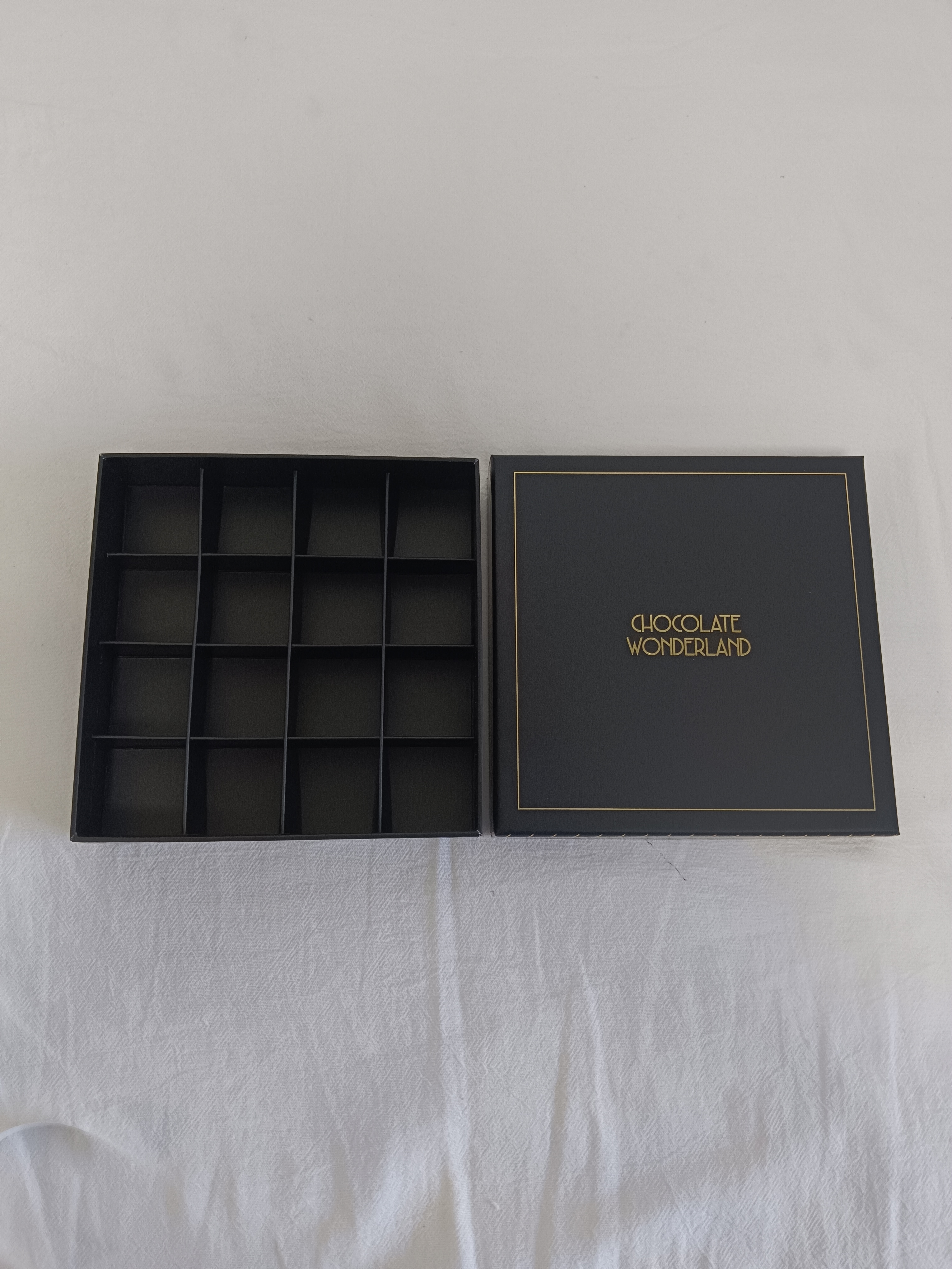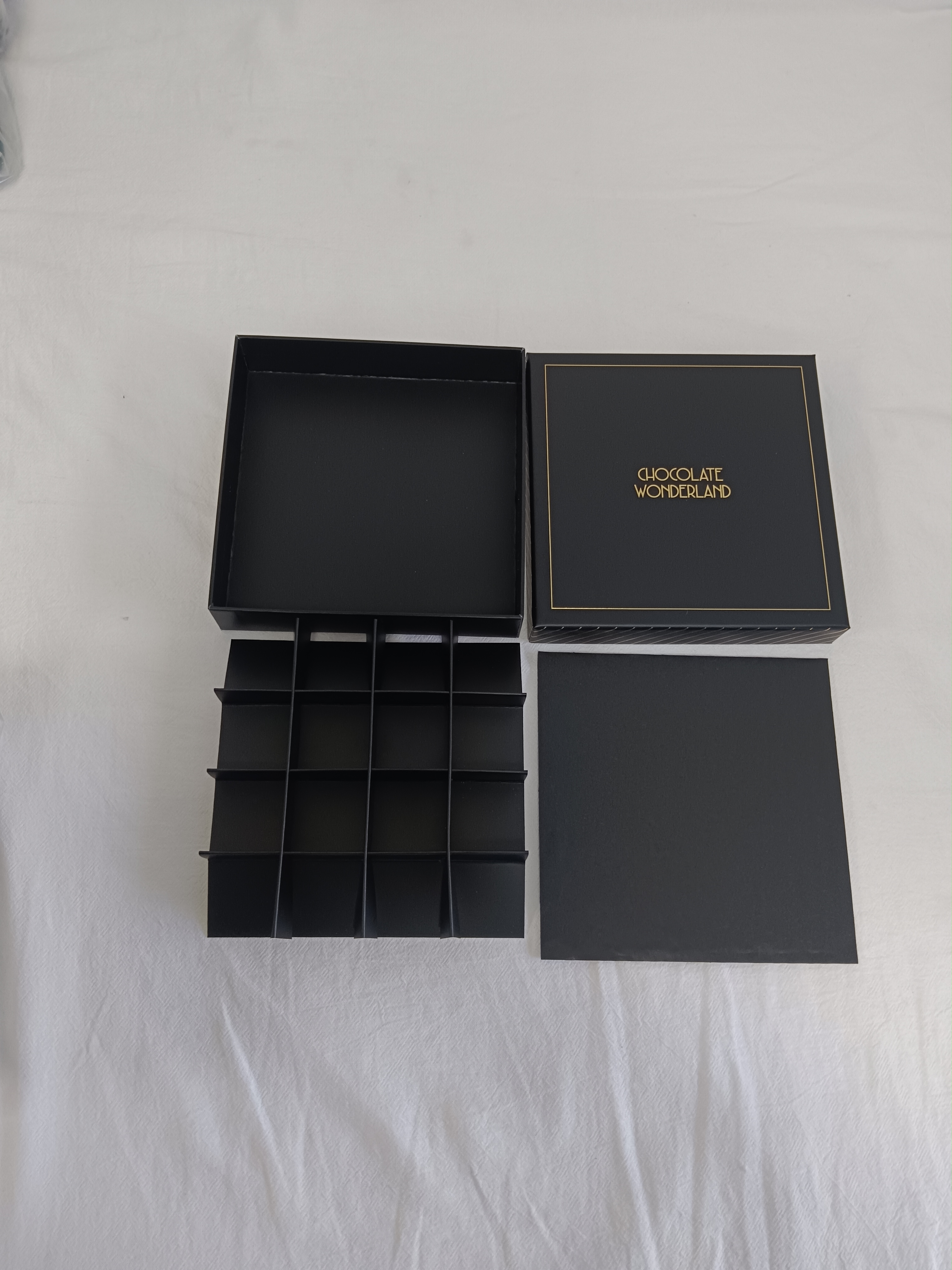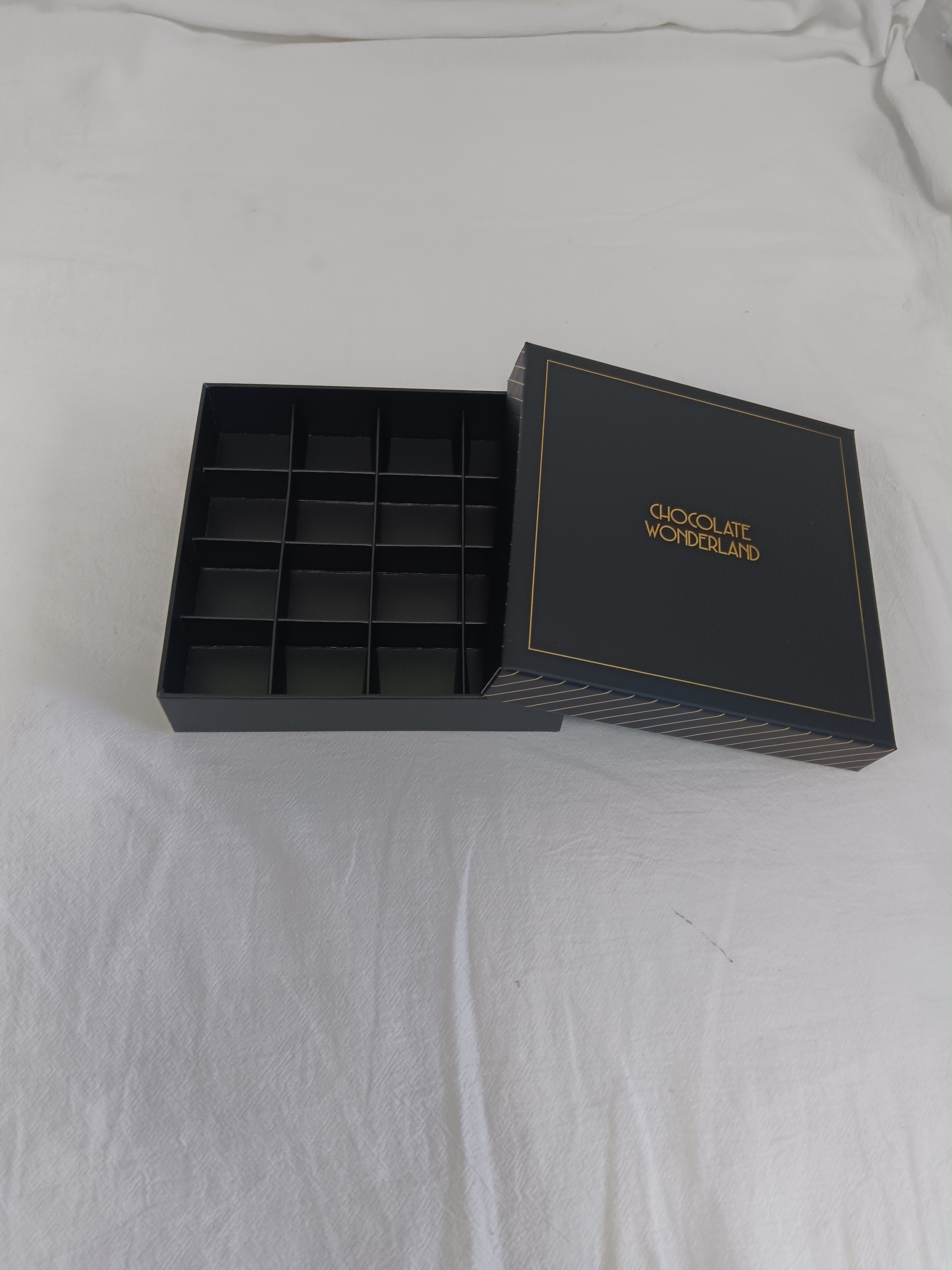 Crafted with a sleek black finish and elegant gold detailing, this chocolate rigid gift box not only exudes luxury and sophistication but also features a practical partitioned interior that securely holds individual chocolates, ensuring they remain intact and presentable; its premium construction and eye-catching design make it perfect for gifting, retail display, or special occasions, seamlessly blending aesthetic appeal, functional organization, and a memorable brand experience that elevates the chocolate-gifting journey.