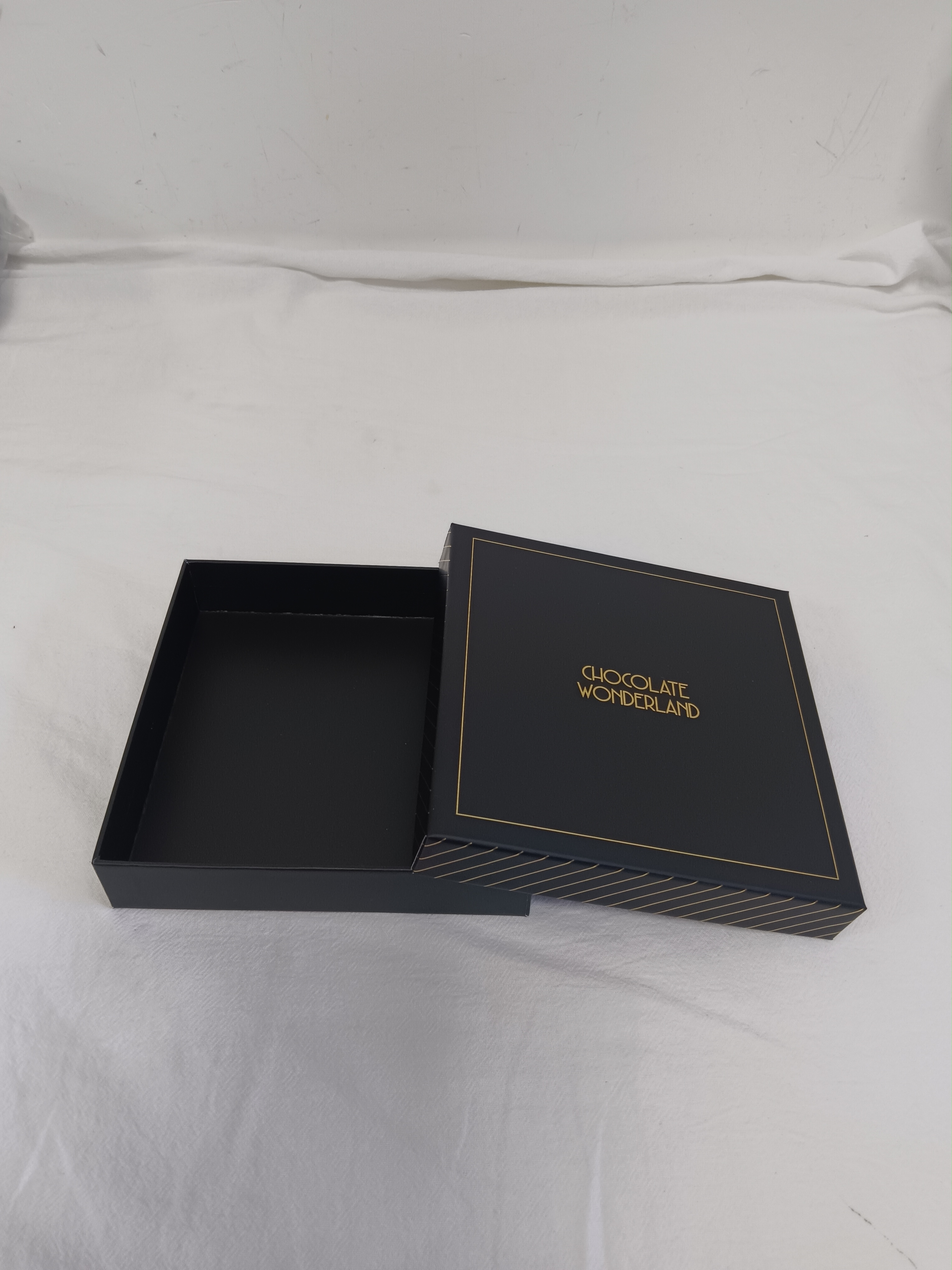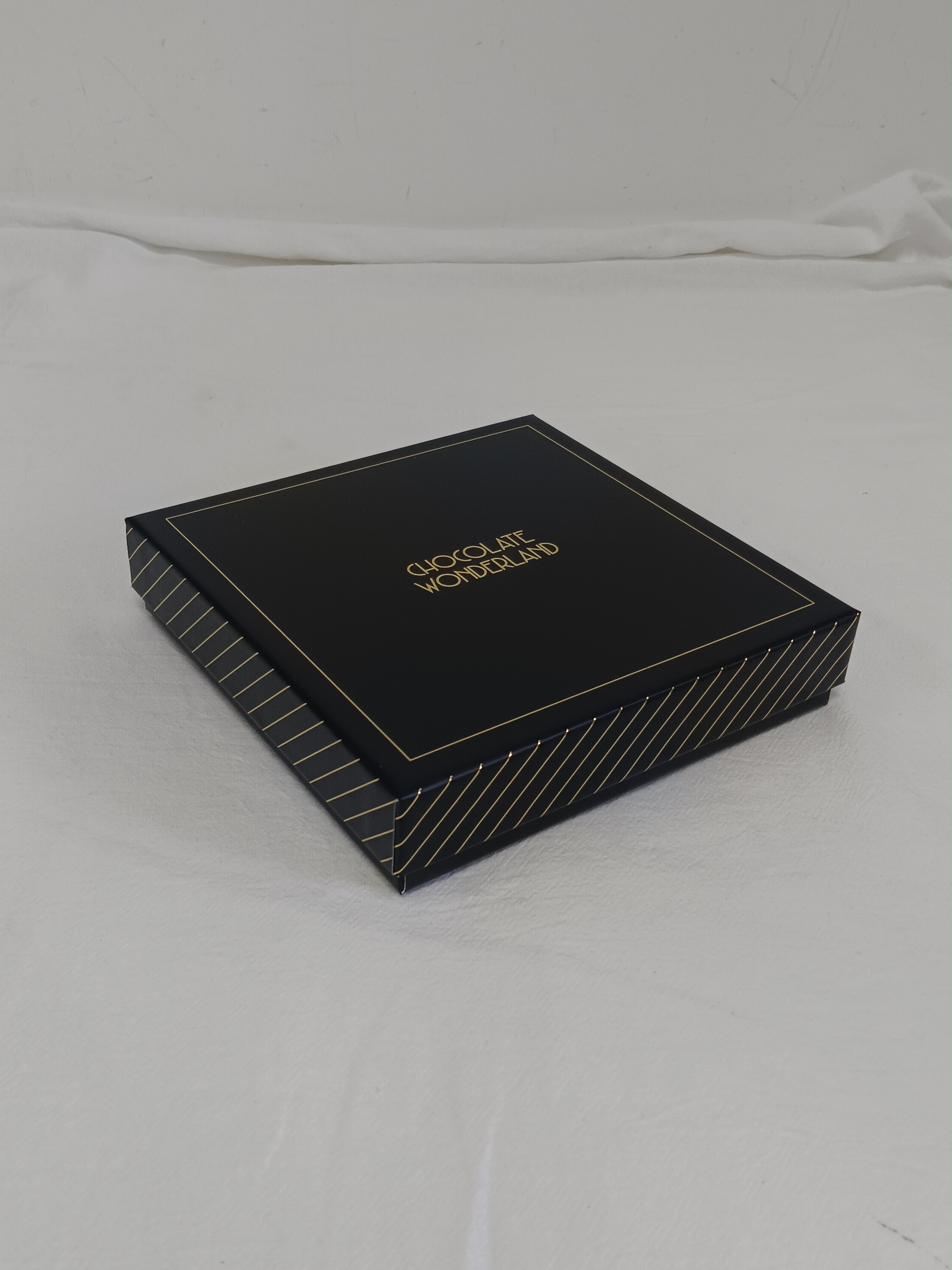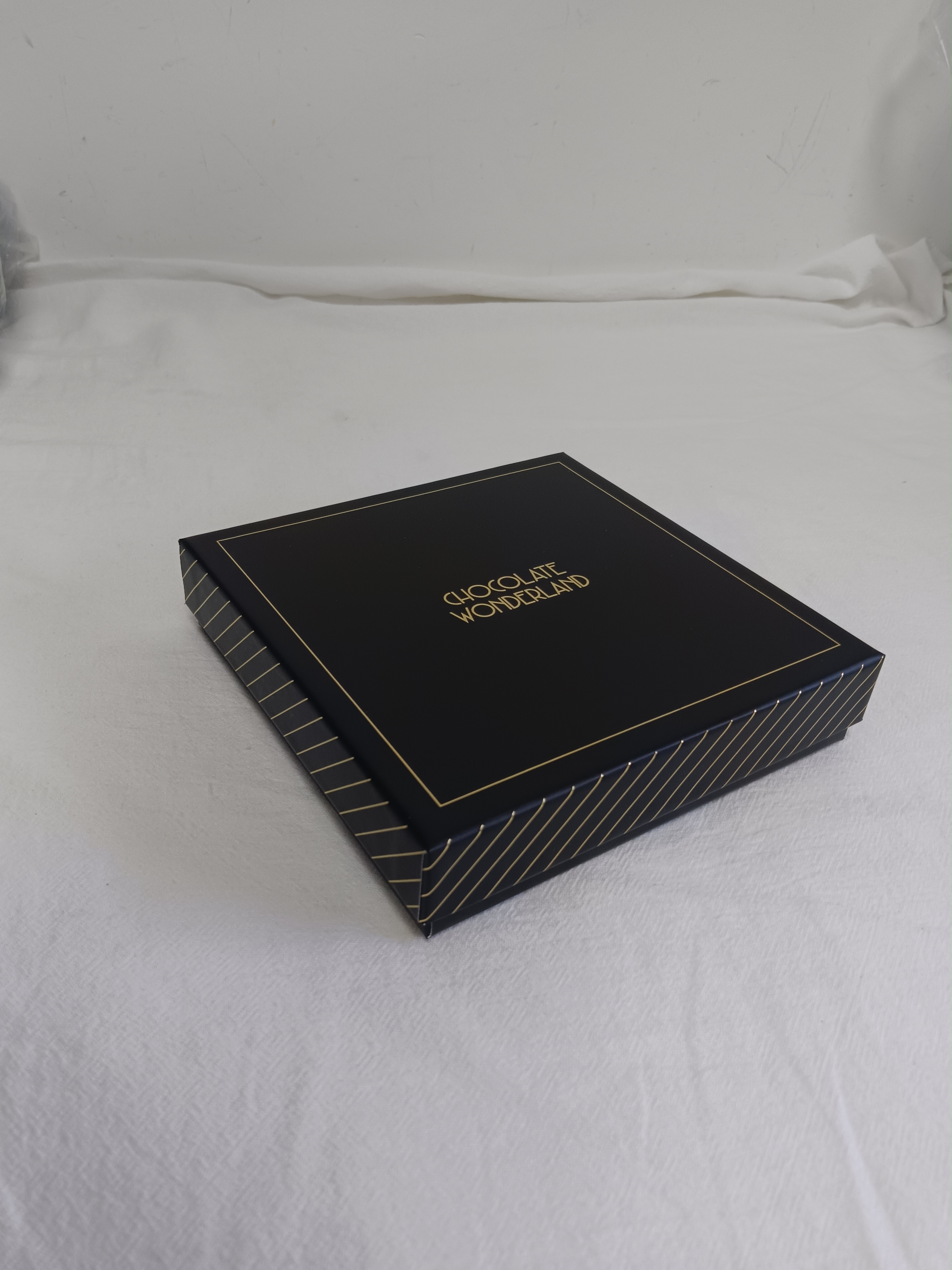 Crafted with a sleek black finish and elegant gold detailing, this chocolate rigid gift box not only exudes luxury and sophistication but also features a practical partitioned interior that securely holds individual chocolates, ensuring they remain intact and presentable; its premium construction and eye-catching design make it perfect for gifting, retail display, or special occasions, seamlessly blending aesthetic appeal, functional organization, and a memorable brand experience that elevates the chocolate-gifting journey.
