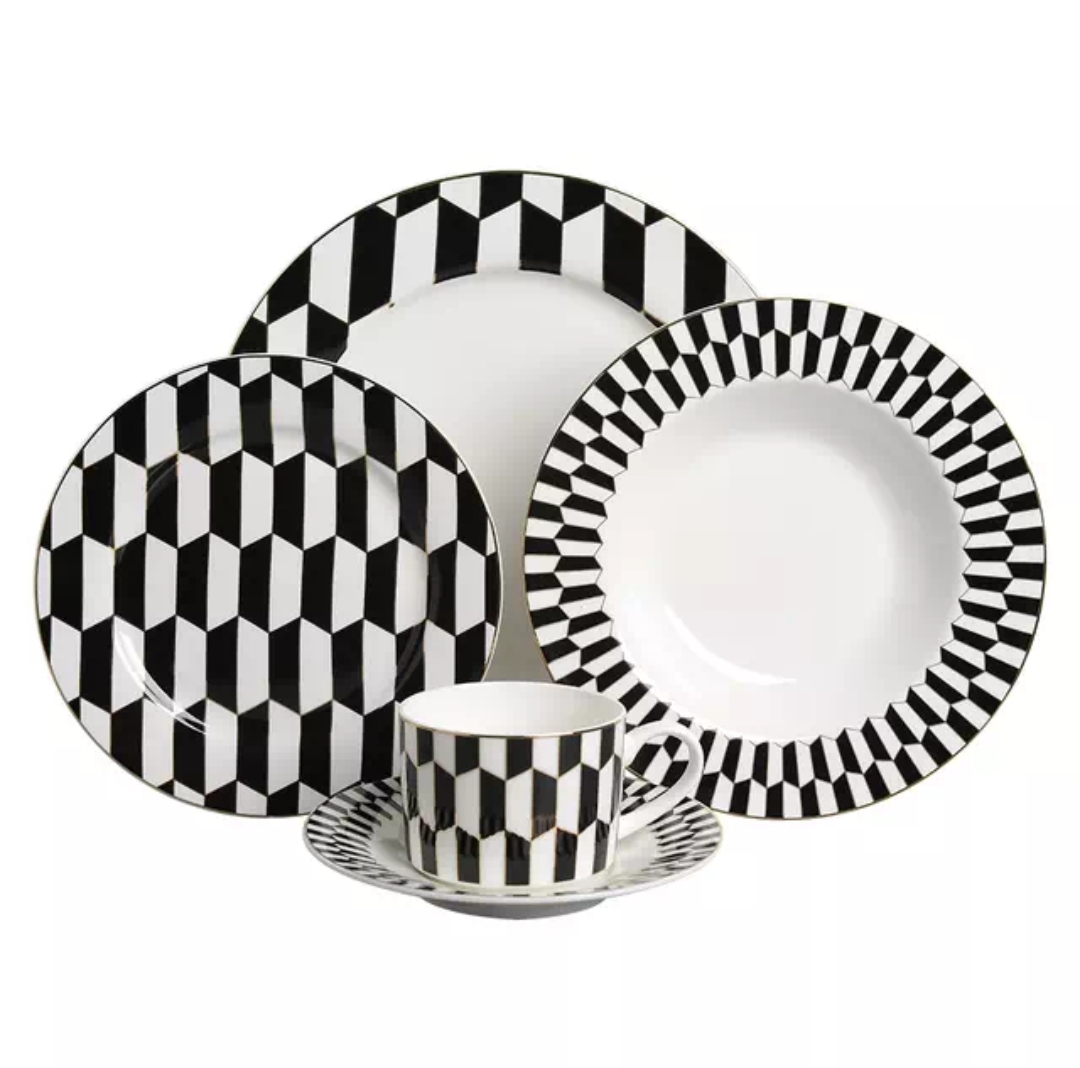 Elegant Porcelain 20 Pieces Dinner Set Black and White Pattern