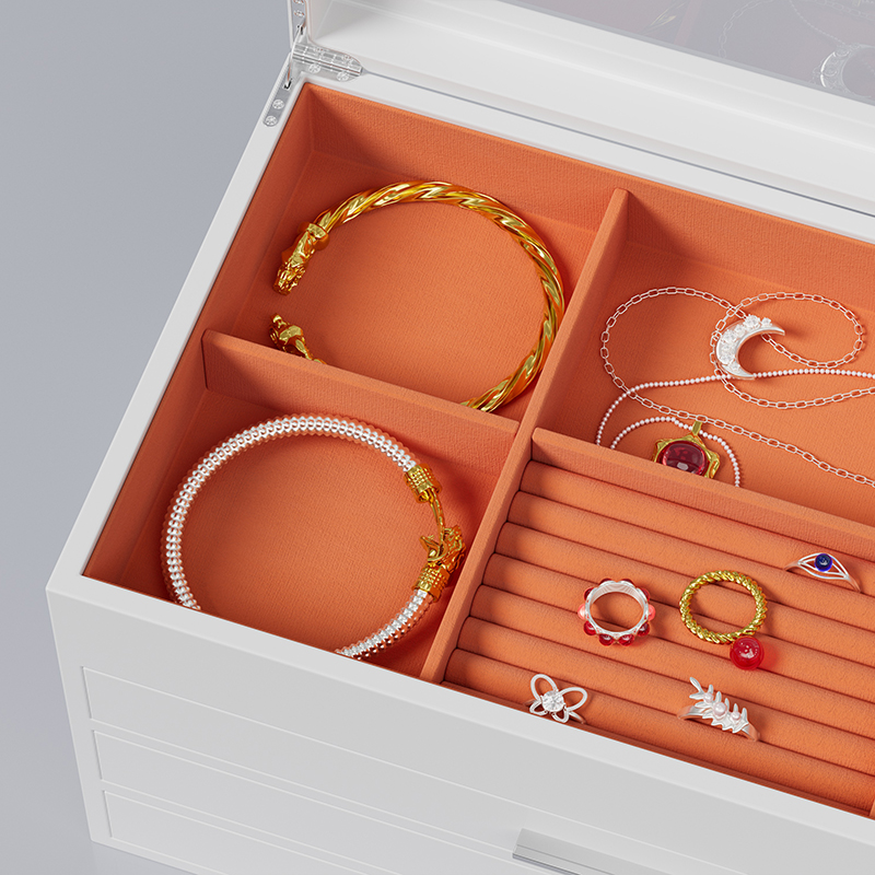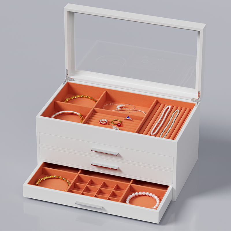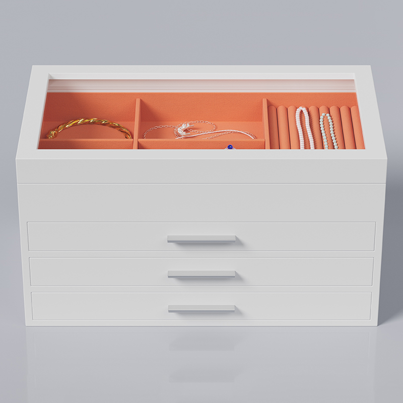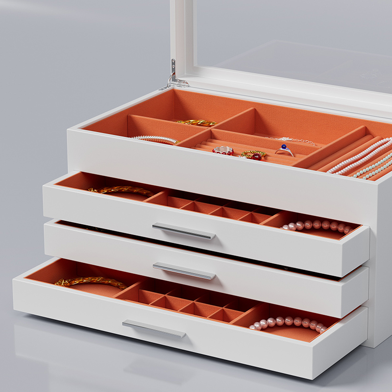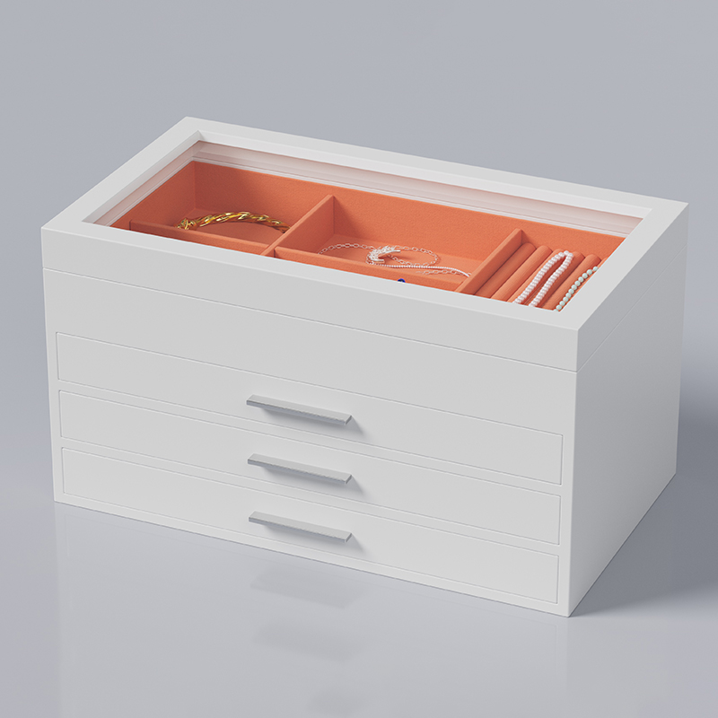 A chic and versatile white jewelry box, perfect for organizing your treasured accessories. Its clean finish complements any decor while providing a soft, scratch-resistant interior to keep necklaces, rings, and earrings safe and tangle-free. Ideal for daily use or as a beautiful gift.