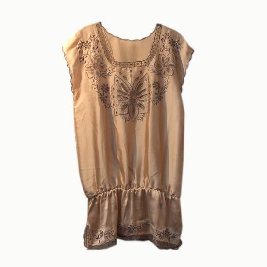 • This is a sleeveless blouse with floral embroideries in brown.