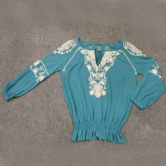 This long-sleeve blouse features exotic embroidered patterns at the self-tie crisscross collar, shoulders and sleeves in white color. The bubbled cuffs match well with the smocked hem with ruffles. You can wear it with any jeans or skirts for a chic bohemian-style.