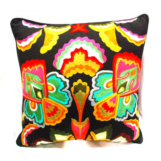 This embroidered cushion flaunts a colorful style. It is hand-embroidered with threads in vivid colors. The Indian design offers an exotic touch. It makes a decorative and comfortable household furnishing item.
