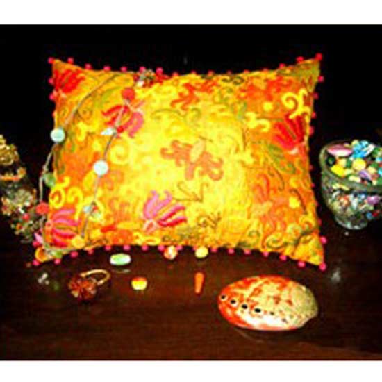 The captivating rectangular-shaped cushion steals your heart with its well-executed ethnic design. The luxurious golden color makes a phenomenal match with the exotic patterns in red and pink, bringing out the best out of an already-beautiful piece. Exhibit your astonishing taste in home furnishing with this embroidered cushion.