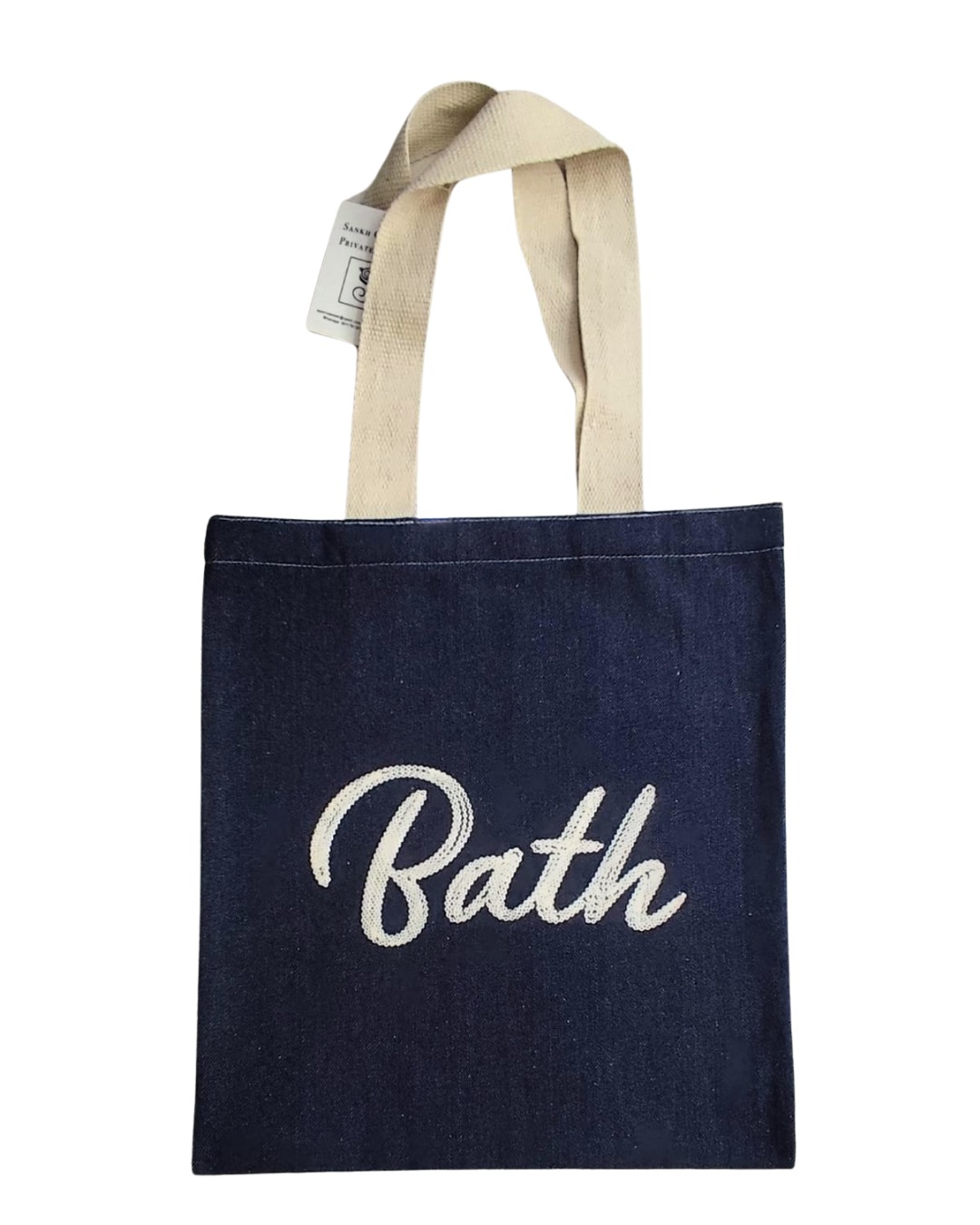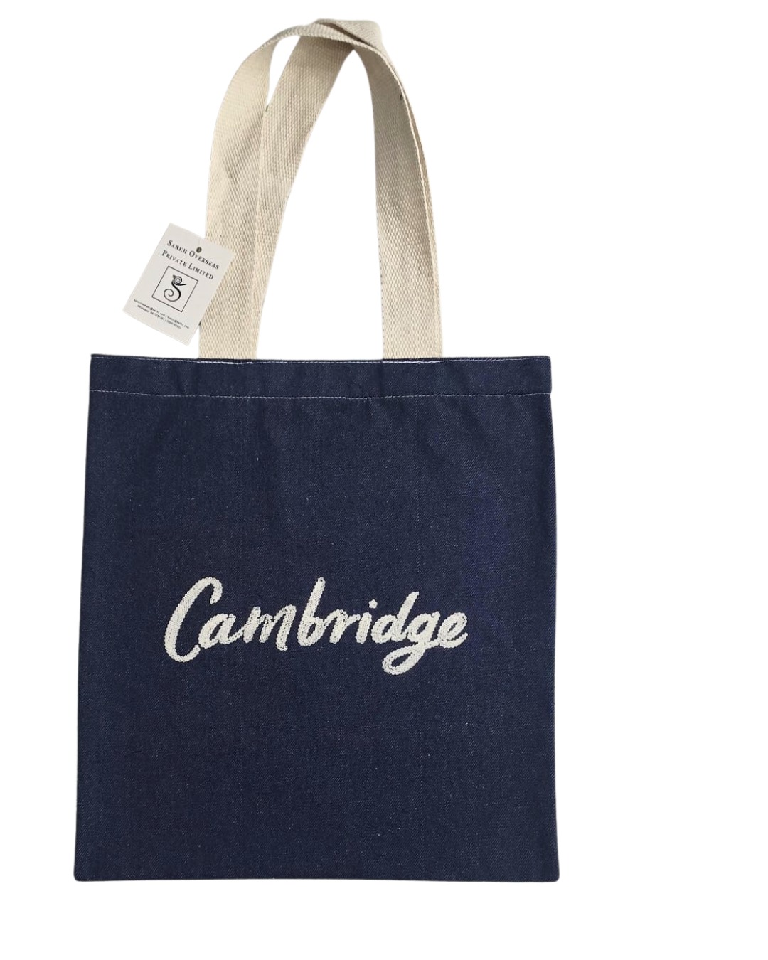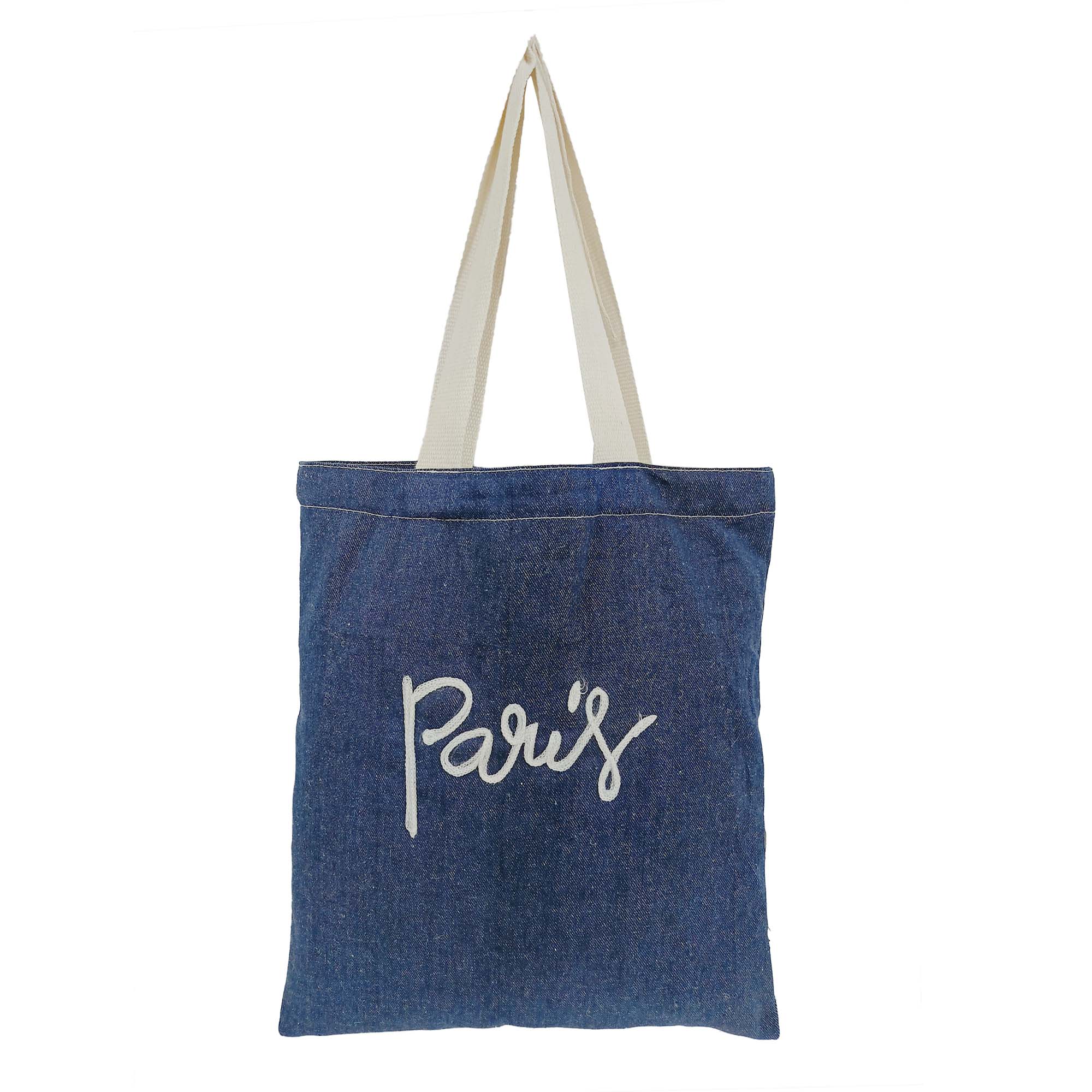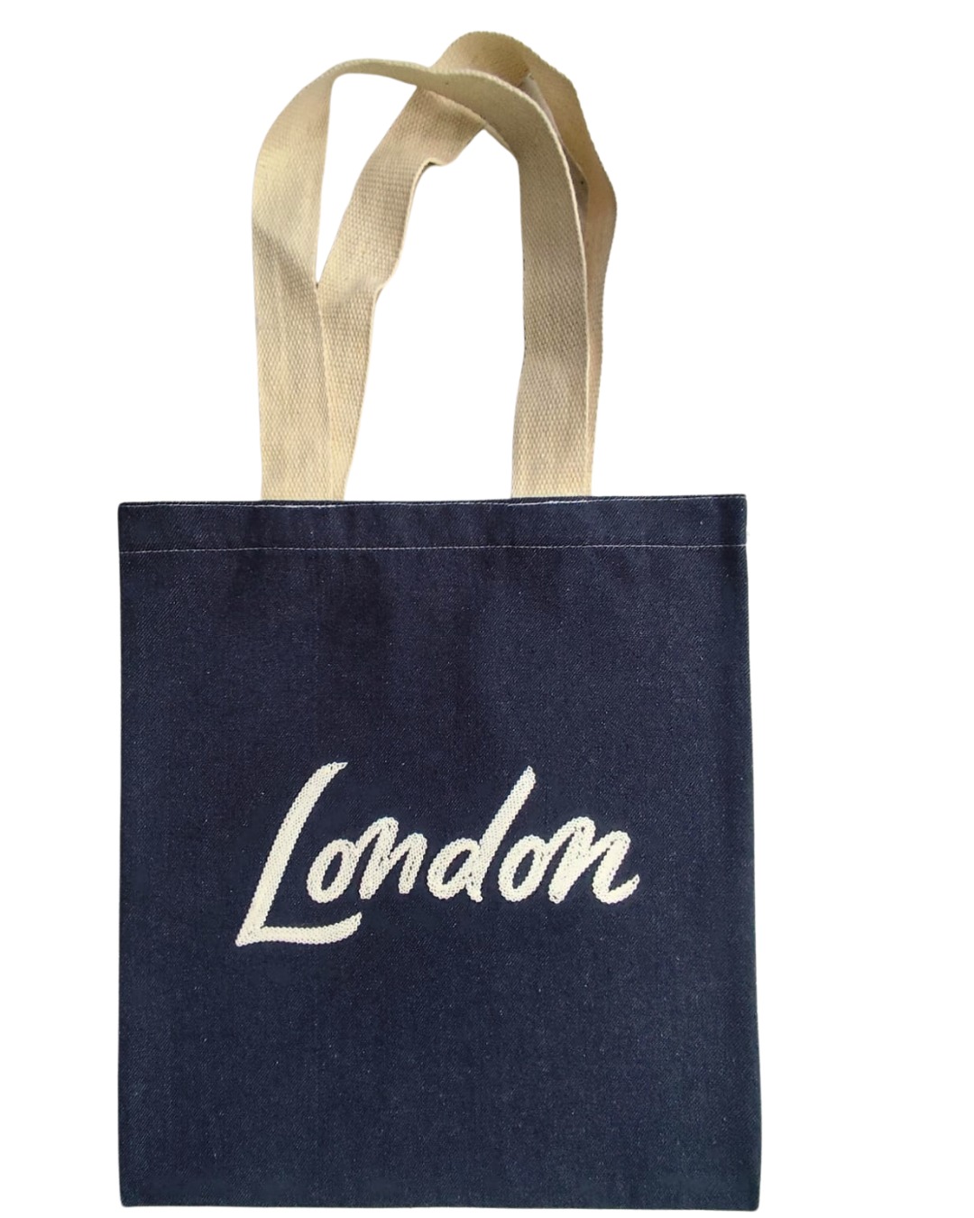 Blue Embroidered Denim Tote Bag (34x38 cm). Size: 34x38x0 cm / Handle: 4x56 Cotton Off White Tape. Print: 1 colour Flok 1 side - Artwork - London - Materials 300 GSM blue denim. Accessories Hangtag,Lable,Temple Island Collection,Visitor:,Product Code:72002.