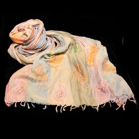 This gorgeous scarf features thick stripes of assorted soft colors. Embroidered paisley print patterns add charm to this scarf. Pretty and comfortable to wear, this exotic scarf is an ideal daily accessory.