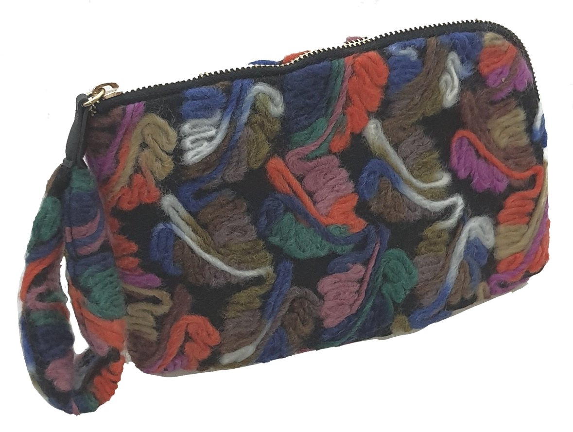 Body in embroidery wool look fabric, Inside in cotton, shiny gold finish metal zipper for closure, wristlet handle