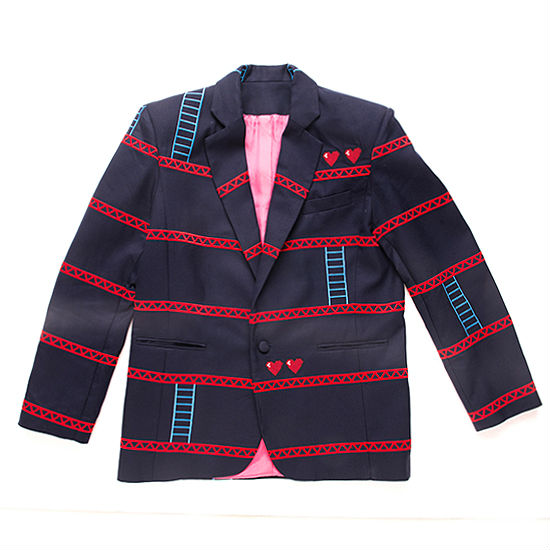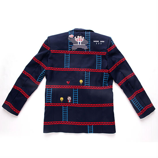 This wool cotton blend jacket is a statement-making fashionable item for any man’s wardrobe. Offering a modern, stylish take on the classic arcade game design, the embroidery jacket comes with iconic details of the platforms and ladders. The back of the garment features a delicate protagonist and a large gorilla for further striking appeal.