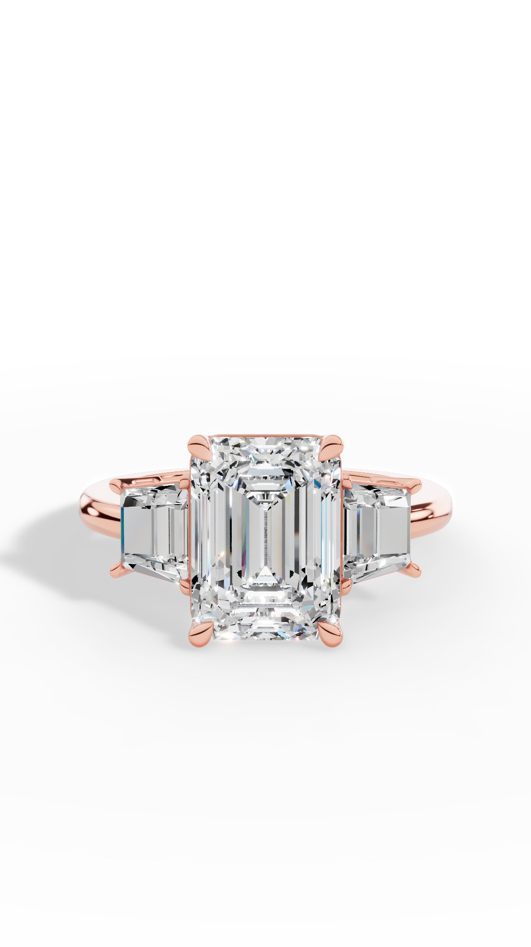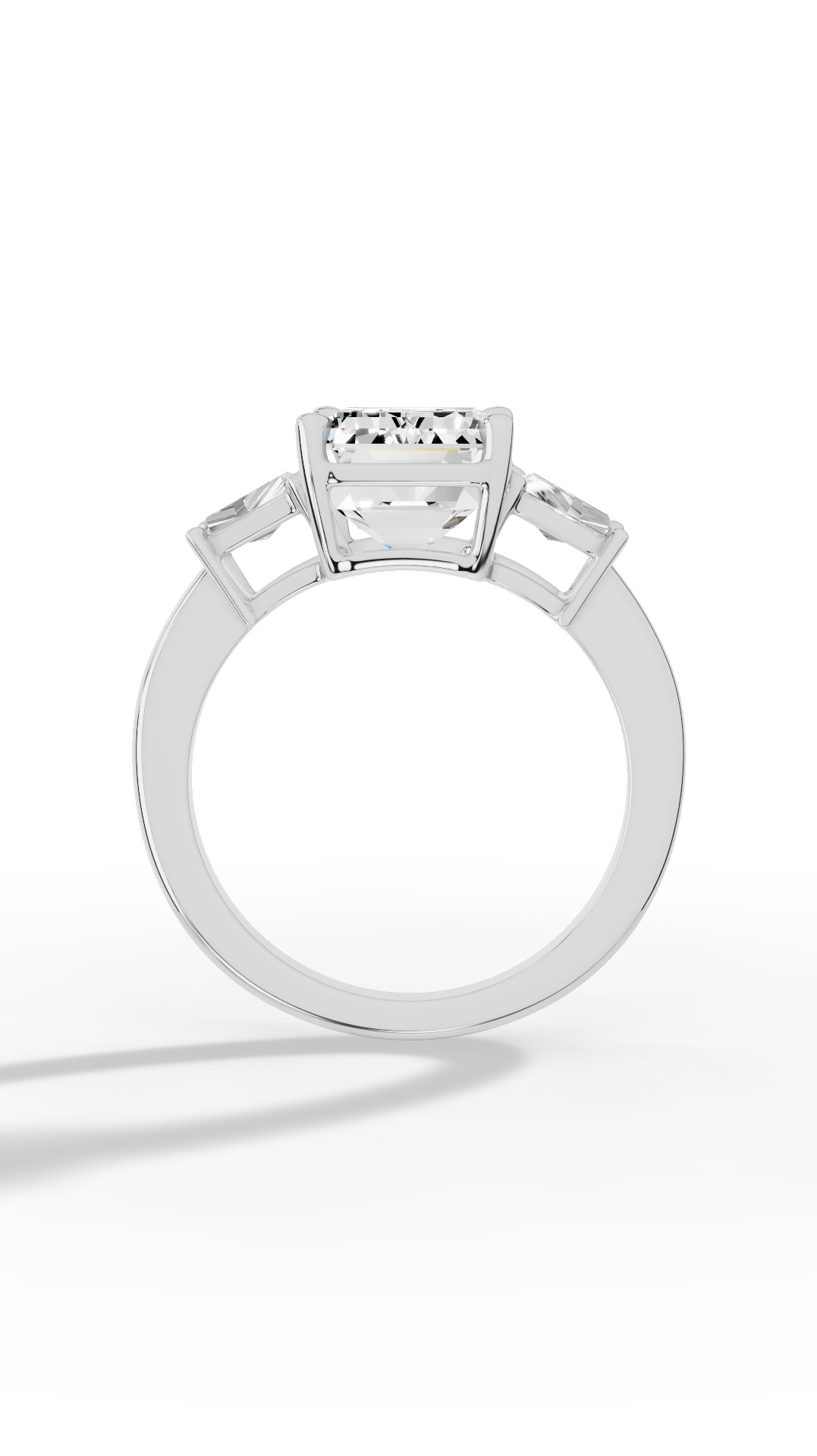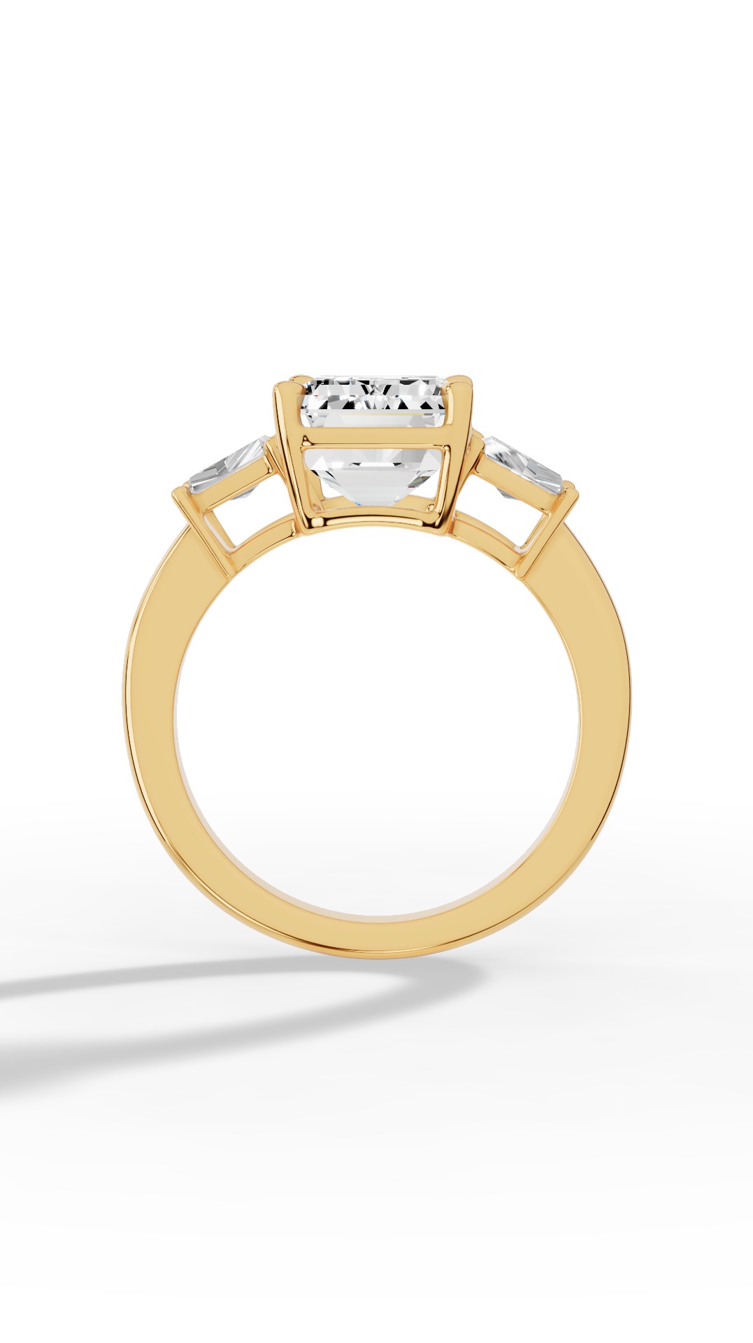 Ring A captivating tri-stone ring featuring a centered Emerald-cut lab-grown diamond flanked by two elegant baguette diamonds, radiating modern grace and timeless sophistication.