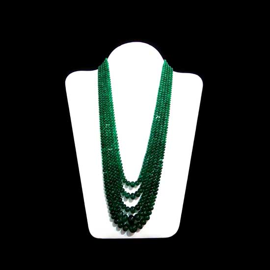 The displayed necklace features five rows of round emerald beads in gradient sizes. The glossy beads come in a deep green color adding a glamorous touch to your look. This eye-catching necklace makes an irreplaceable addition to your jewelry box.