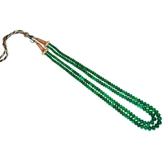 This necklace consists of numerous outstanding-looking emeralds. Their colours are generally in green, but with slight difference. Some of them show a lighter colour, while some look darker. They are orderly displayed in two rows, between which there is a little space.