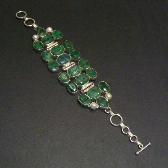 The featured jewellery is a sterling silver and emerald bracelet for ladies and women. Pear cut and irregular cut emeralds are bezel set on the silver mounting, which are decorated with four round pearls on the two ends to add a elegant feature to the piece.