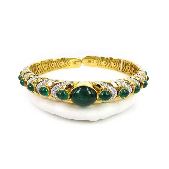 Displayed is an emerald choker necklace that is mounted on yellow gold for a royal look. The 21 emerald pieces, featuring a smooth cabochon cut, are spread evenly along the chain. This emerald choker necklace is accented with diamonds for additional fashion.