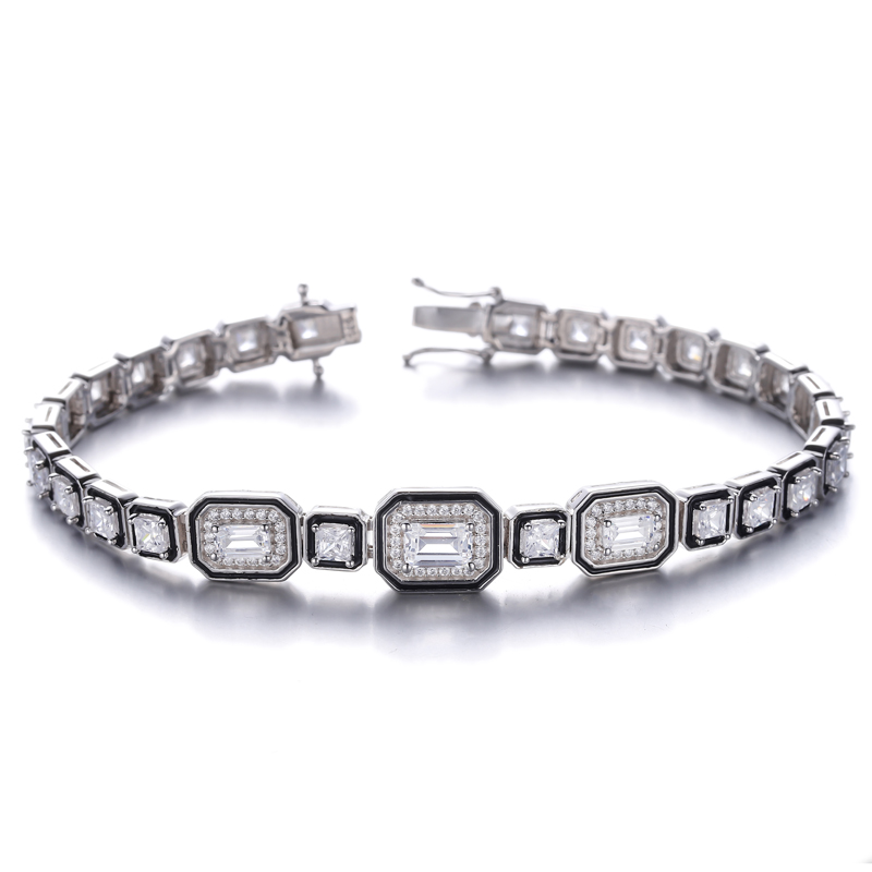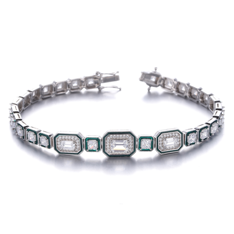 Emerald Cut And Square White Cubic Zircon Rhodium Silver Bracelet With green Enamel