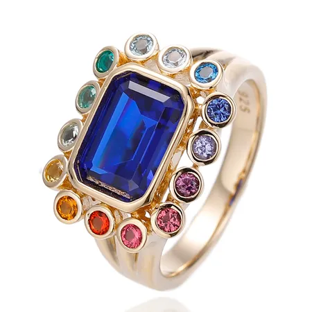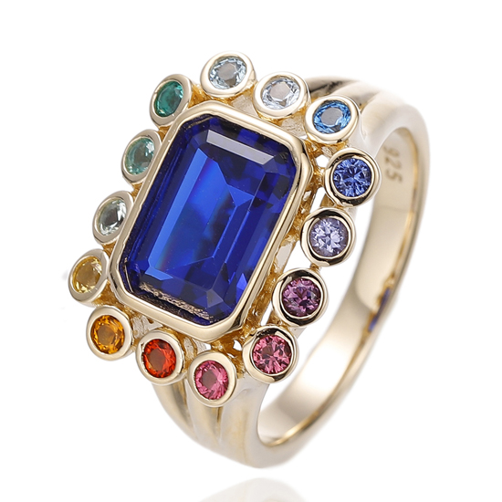 Emerald Cut Blue Nano And Round Rainbow Cubic Zircon Silver Ring With Gold Plating