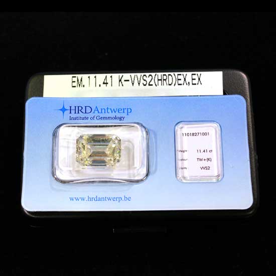 This emerald cut fancy diamond presents spectacular glamour with a light hint of yellow. Weighing over 11 carats, this loose stone is an impressive choice for jewelry application. This exceptional quality of this diamond is also confirmed by the HRD Antwerp certification.