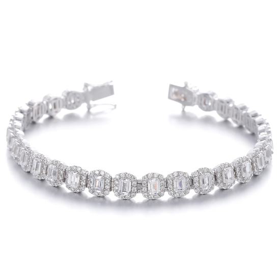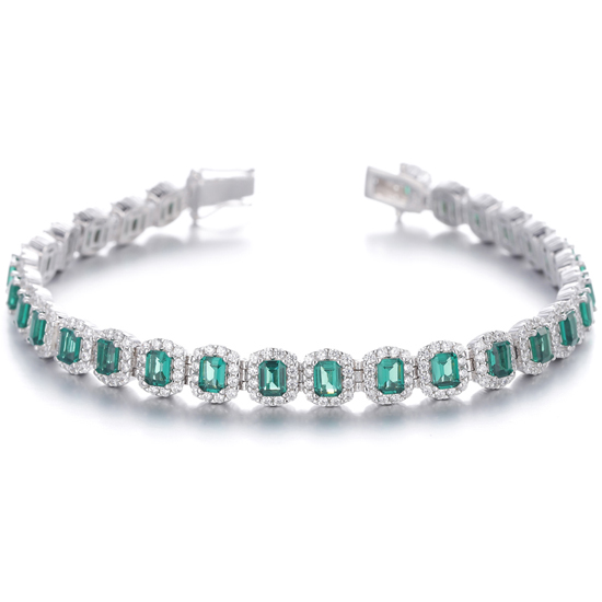 Emerald Cut Green Nano And Round White Cubic Zircon Rhodium Silver Bracelet