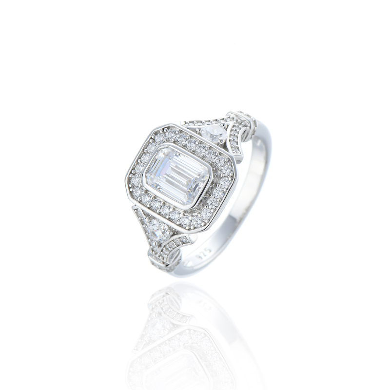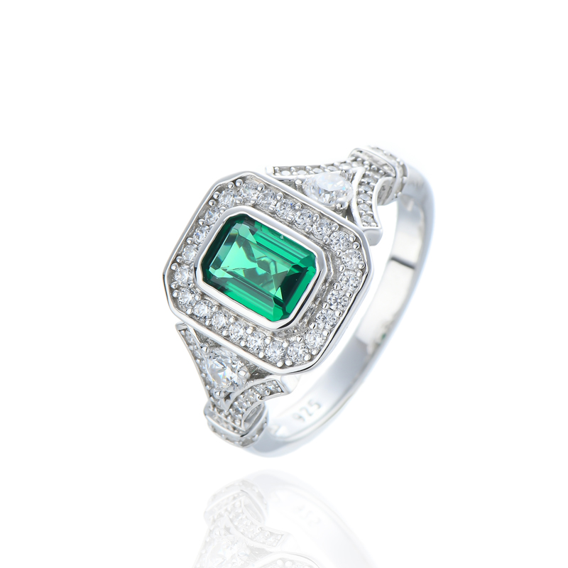 Emerald Cut Green Nano And Round White Cubic Zircon Rhodium Silver Ring