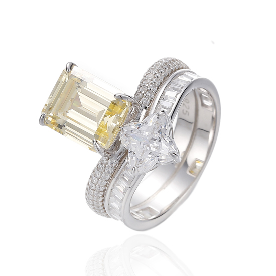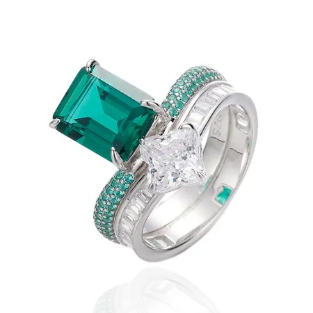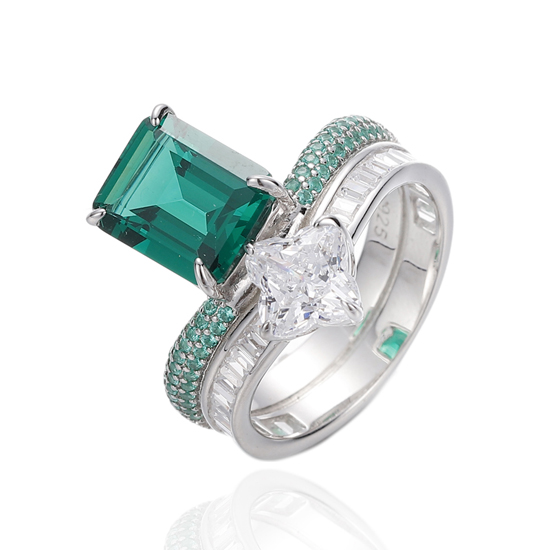 Emerald Cut Green Nano And White Cubic Zircon Rhodium Silver Ring