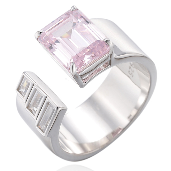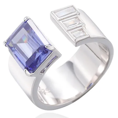 Emerald Cut Tanzanite And Baguette White Cubic Zircon Rhodium Silver Open Ring