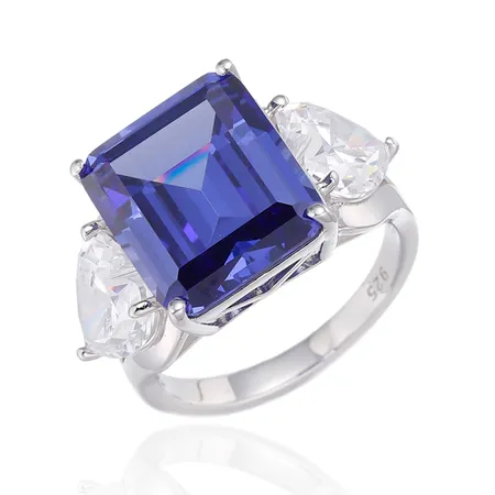 Emerald Cut Tanzanite And Heart Shape White Cubic Zircon Rhodium Silver Ring