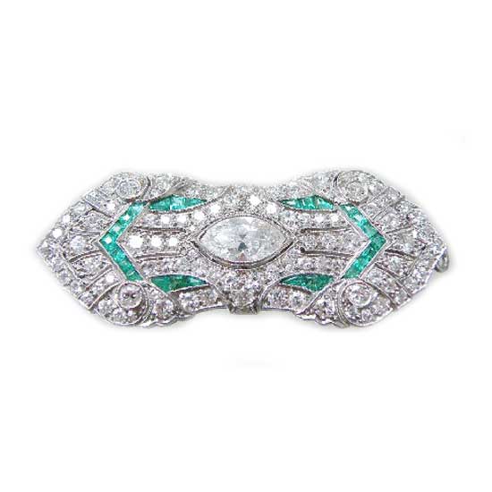 This exquisite Edwardian platinum emerald and diamond brooch was originally crafted in Paris in around 1910. It is delicately crafted with refined details for a sophisticated look. This brilliant emerald diamond jewelry can be worn as a brooch or a pendant.