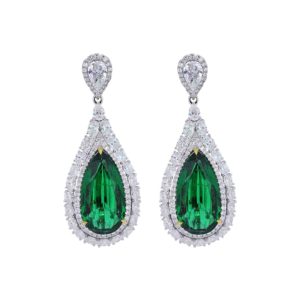 • 2pcs PS EM, 25.78ct, Zambia, Vivid Green, Minor, GRS 3.16ct, RD White Dia, 516pcs 0.42ct, PS White Dia, 2pcs 4.96ct, OV White Dia, 42pcs 0.46ct, OV White Dia, 4pcs 1.45ct, PS White Dia, 2pcs 18.70g, White Gold, 18K