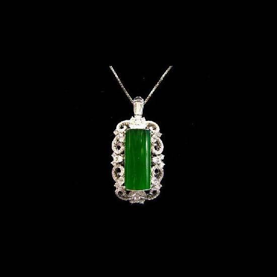 • This elegant necklace is composed of a large emerald jade centrepiece with a diamond border