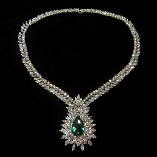 The stunning necklace touts an eye-catching setting, featuring the precious African emerald. The well-crafted emerald emits irresistible green sparkles that are absolutely glamorous. Embellished with the twinkling diamonds, the luxurious necklace is an ideal item to enhance your evening gown.