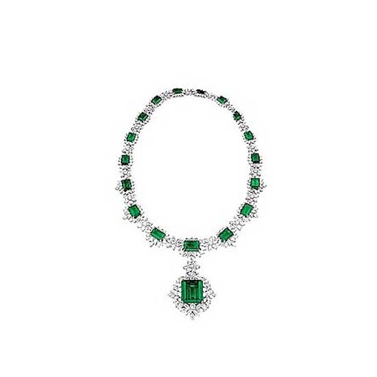 This extravagant necklace features a glittering silvery band, embellished with a green emerald. The necklace also boasts a classic pendant with a remarkable-size emerald, shining with the most intense and radiant green with no obstruction.