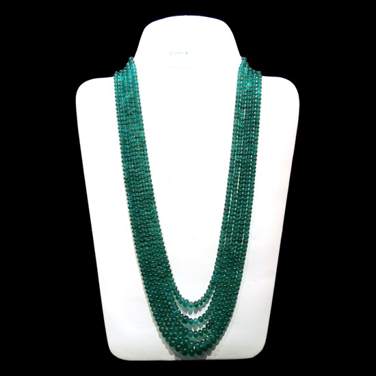 Showcased here is an extravagant emerald beaded necklace. The fine emerald stone boasts deep, clear turquoise green hues. The multi-strand design exemplifies sophistication and luxury.