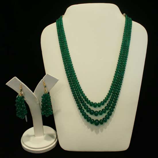 This emerald necklace and earrings set boasts a simple and luxurious design. The necklace showcases three line made up of emerald beads. The earrings are embellished with emerald pendants, resembling grapes. This graceful set boosts the glamor of wearer.