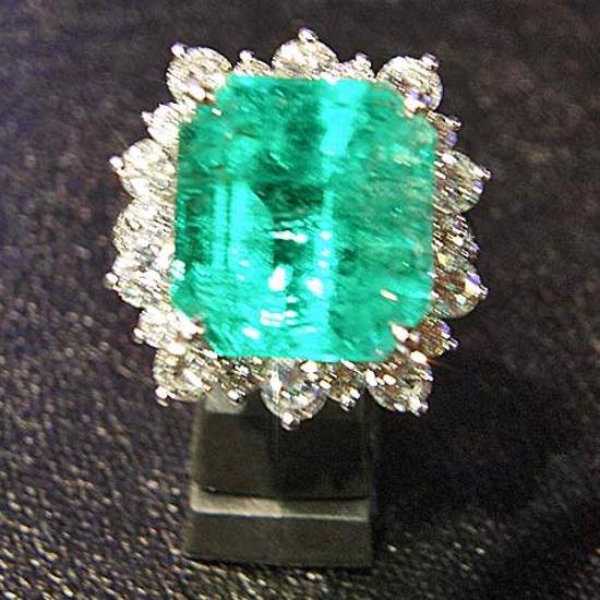 This is a platinum ring with a big radiant emerald. The mixed-cut emerald is surrounded by about 20 round diamonds in two sizes. The design is classic and elegant.