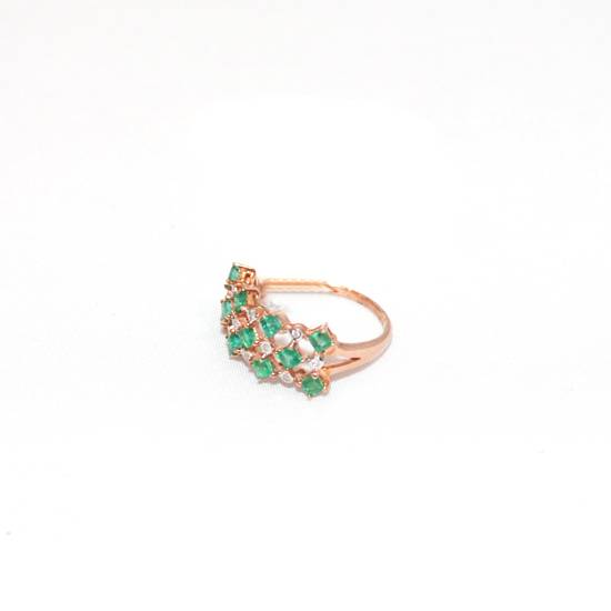This is a ring decorated with emeralds and diamonds. The emeralds are green and white in color and are square shaped. The ring can be made with 14K or 18K yellow gold.