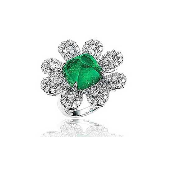 This dainty ring features a blossoming flower, with a remarkable cushion-cut emerald lodged in as a flower bud. The emerald bud suspends petals in all directions and the petals are all embedded with glittering stones to shine with alluring radiance of botanical beauty.
