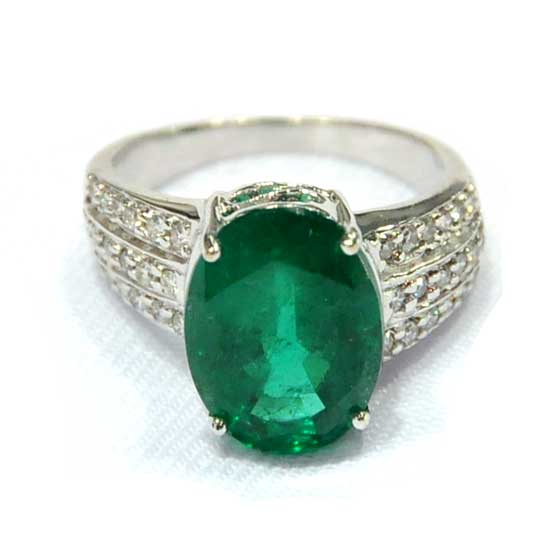 The emerald ring is characterized by the 18K white gold casting. It is set with sparkling diamonds for added class. Add this emerald ring to your fine jewelry collection.