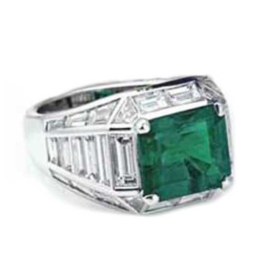 This emerald ring spotlight a diamond-cut emerald stone accented with round brilliant and baguette diamonds. The fancy ring is finely made of white gold in a polished finish. This gorgeous emerald ring is a wonderful addition to your jewelry collection.