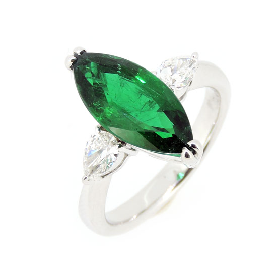 This is an emerald ring certified by Central Gem Laboratory in Japan. The emerald is shaped into a marquise-cut for added shimmer. The ring adds grace and charm to your finger.